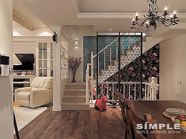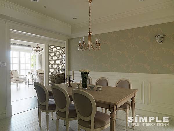像此案的淡綠色花卉壁紙就遙相呼應入口的縷空屏風,也和淡金色吊燈、淡紫色餐椅,共築出法式優雅。光線也會影響色彩表現,這是更為細膩的設計安排。