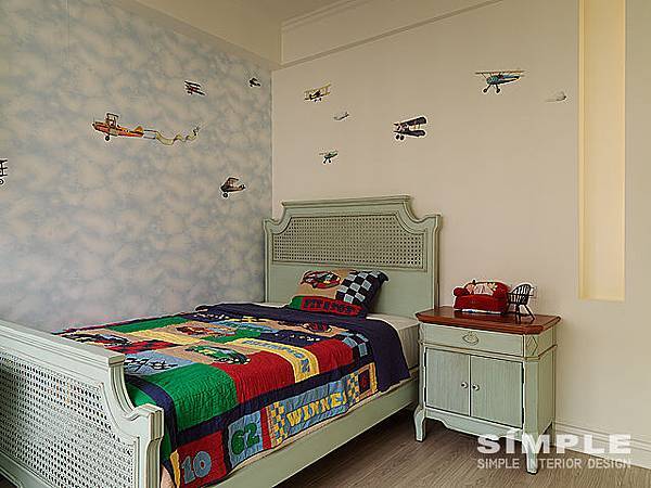 壁紙加上壁貼又多了一種變化,雲朵壁紙加上飛機壁貼,飛機是由另一面牆飛過來的~給小男孩更生動的飛行想像~