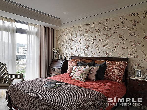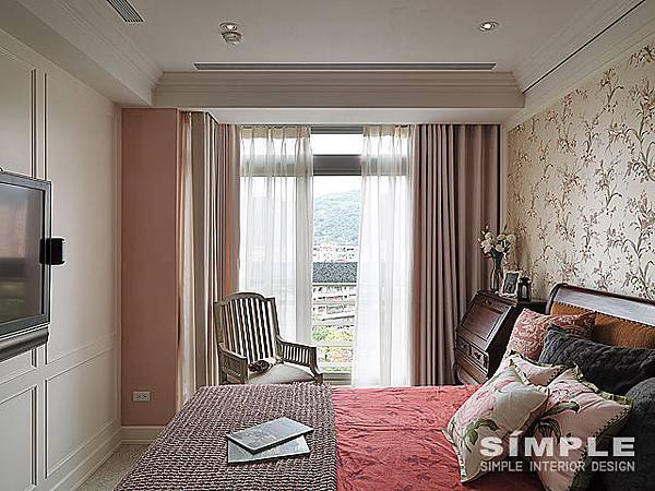 主臥也走粉色系,花卉壁紙帶出典雅氣息,床鋪兩旁搭配寫字台與小櫃,沈穩不失律動,落地窗旁牆面漆上粉色,和壁紙色系呼應,整個臥房洋溢浪漫典雅的氣息,倚著窗看著夕陽,心情沈穩而輕鬆。