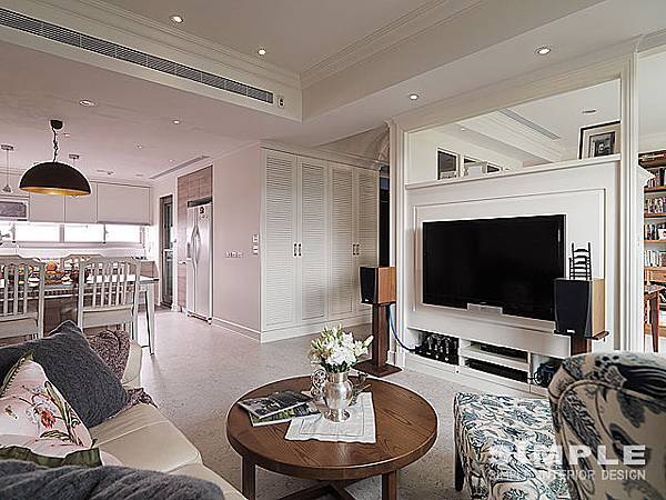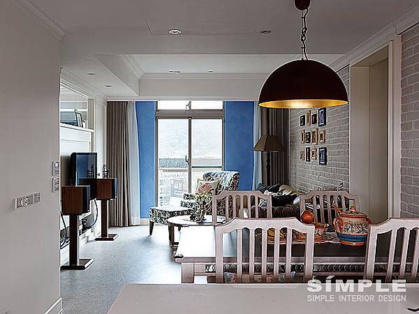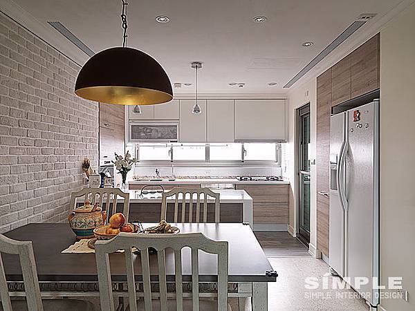 客廳文化石牆給予鄉間幽然的情境,放上家人間親密照片,一入門就感受無比幸福。開闊的廚房與客廳成一氣,自然光就這麼一路灑進來,女主人可以像在國外別墅般,邊做菜邊眺望窗外。