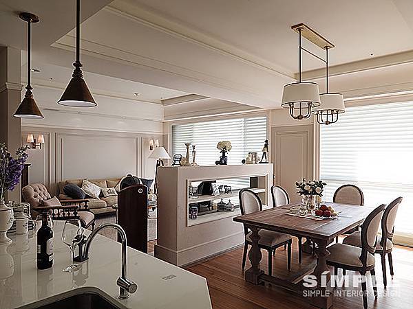 客餐廳和廚房中島組成一個通透的公共空間。客餐廳之間的半高電視櫃,兩側沒靠牆,造成環繞動線,為空間增加了使用樂趣。中島台可欣賞落地窗外美景,並讓媽媽能輕易掌握小孩在客餐廳的動態。