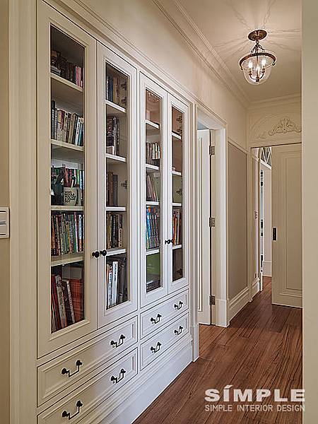 通往臥房的走道,牆面內嵌書櫃,讓人們多了駐足的理由,同時又可避免玻璃門內的眾多書籍面向客餐廳,破壞了整體的簡潔美感。走道的左右原本各有2個房間,主臥房對面的那間被改為更衣室,兩者共享一個走道拉門,只要關上,就是一個獨立的完整空間。