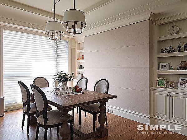 Tang的家有美式風格常見的線板,但是有的地方做了跳色處理,例如玄關以灰藍色牆面搭配白色線板,沉穩內斂。照明運用也很美式,看不到一開就空間全亮的吸頂燈,但是有造型古典優雅的吊燈、壁燈、立燈,為不同區域提供溫暖。