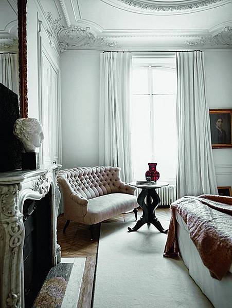 飾有線板的細長木門是巴黎住宅顯著的特徵,這樣的木門也運用於房間裡。常見金邊鏡飾、茶几、邊櫃,以霧金色傳遞低調貴族氣息,造型更是輕巧流暢。加上源自對古董的崇敬,住家一定有幾件老東西。