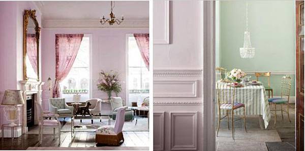 隨處可見如藤蔓般曲線優雅的鑄鐵、銅雕,尺度比例較為修長、弧度多,無論長窗、家具乃至燈飾比例都較為細長,予人精緻纖巧的感覺。家飾的用色就像馬卡龍般的粉嫩繽紛。這些材質用色都被融入空間裡,自然的呈現出來。