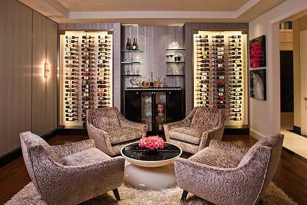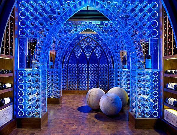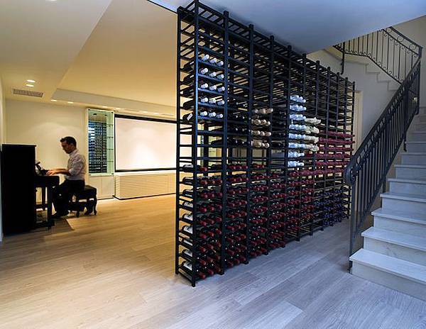 溫度是保存葡萄酒最重要的條件,這一面展示架用玻璃圍起,形成專業的酒窖環境,夜晚時如同大型的發光體,提供一旁的吧台如Laugh bar般的情境,同樣的概念可運用於客廳或走道。