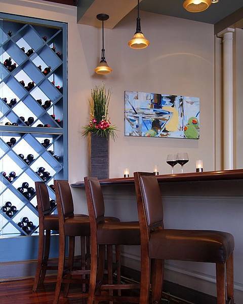 也能把隔間櫃設計菱格狀,除方便隨手擺放酒瓶外,這樣的櫃體還具有視覺通透效果,在許多餐廳也常見這樣的設計。