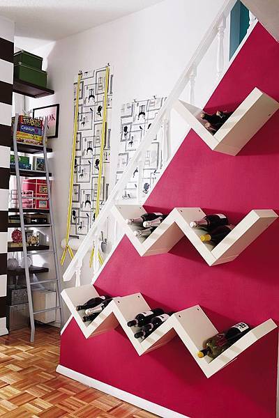 這是最簡便的展示層架,挑一種你喜歡的顏色,搭配這種V型層板,靠一面牆就能塑造出風格,樓梯旁這樣設計,是不是也很有味道,除了酒之外也能用來放書。