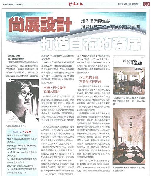好消息!! 由三采出版社出版的《給自己一個自在的窩居: 吳啟民的多樣美式居家》一書,目前已再版至第二版販售中。透過經濟日報在7月20日的專刊中,特別介紹我們的設計總監-吳啟民及我們的公司,除了總監書中詳細地分析出最具代表的六大美式風格個案外,並將其風格的設計要點逐一提示出來。本書不單是結合總監10年的設計經驗和功力,裡頭更詳細解說美式文化背景如何影響其風格,在不同風格且不變的設計基本理念下,秉持著「Simple life with Eco- friendly house」的精髓,使每件經手的案例展現出「風格」、「優雅」、「自然」和「功能」的特質。這篇報導將公司理念及總監吳啟民所寫的美式風格做了的一篇精采報導。