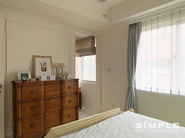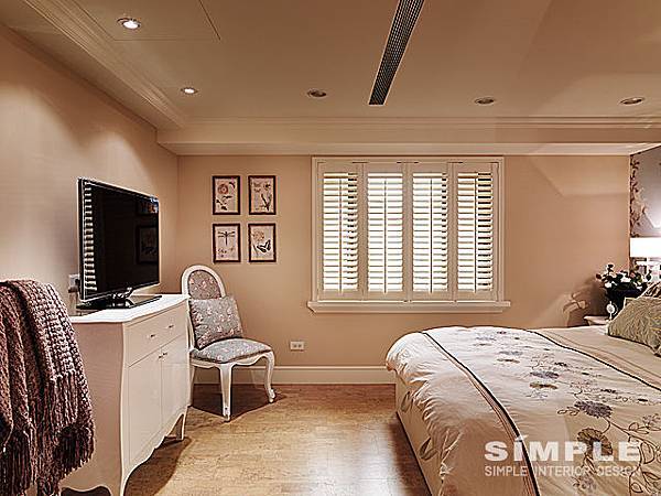 臥房是休息的地方,不需要太多裝飾,可調節光線的木百葉、木質地板簡單舒適,如果有擺放電視的需求,這樣的櫃體簡單大方,窗戶旁四幅花卉畫作給予空間焦點,床頭主牆則貼上紫色壁紙,所謂淡雅的浪漫即是如此。