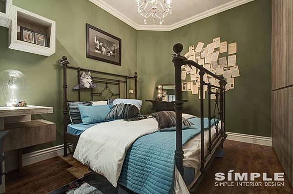 這是女兒房,若是沒告訴你這是女生的房間,我們大概也不會直覺的想說這是女生的臥房,他不是我們習慣以為的那種粉色系很女性的設計。這房間有趣的設計是,在綠色的牆面上,把女兒閱讀過的原文書拆開,一頁一頁的貼到牆面上。