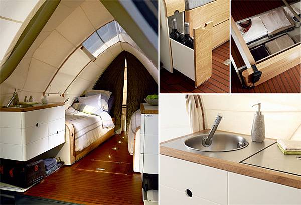 露營拖車的內部,有臥床、簡便的料理台,洗手臺,甚至還有放置紅酒的櫥櫃,足夠旅行時使用。在臥床上方,還開了透明天幕,把車開到海濱山中,就可仰望滿天星斗。