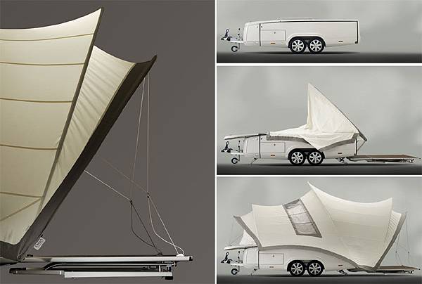 這款opera 歌劇造型的露營拖車,時尚又優雅,收納起來的時候,是個四方形的物體,幾個簡單步驟,升起帷幕,立即變身,成了一部歌劇院造型的行動住所,設計感十足。