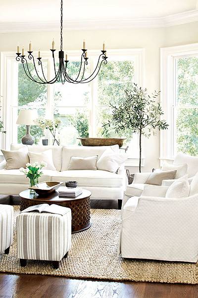 即使是白色也能利用色差表現不同面貌,從牆面的顏色到沙發和椅凳,白色色差成為空間中主要的調性,利用一些深色調的家具平衡空間色彩,像是選用木色地板和深米白色的地毯;以家具來說,咖啡色的茶几和線條優雅的法式吊燈,這些家飾的原始色彩都能達到空間的平衡感,並且形成強烈的對比色調。