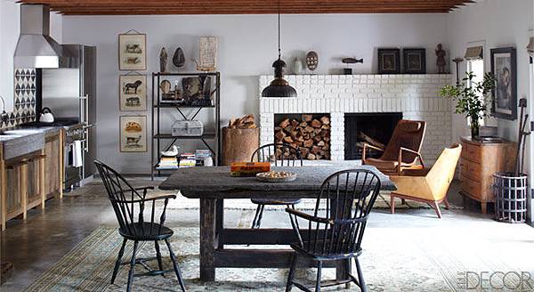 義大利輕工業吊燈懸掛在老舊餐桌上方,美式19世紀溫莎椅與之配合,濃郁的鄉村中帶著世故的味道,火爐前兩張色系相同的單人椅,最靠近壁爐邊的皮製躺椅,是丹麥中世紀造型的設計。