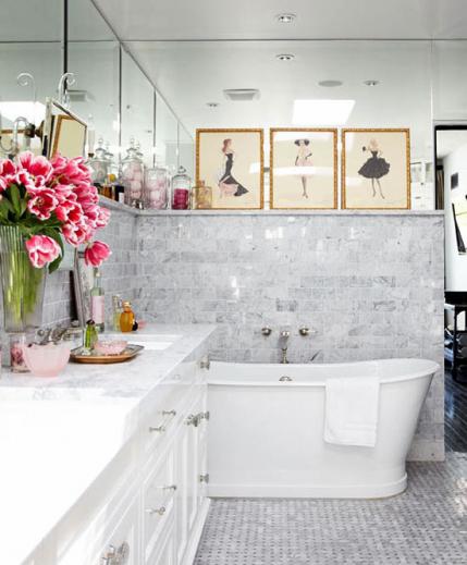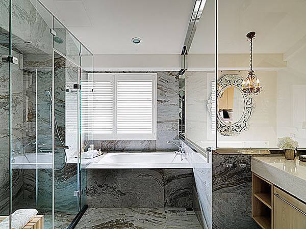 通常主臥衛浴的空間並不大,鏡牆的設計可以放大衛浴的空間感,在浴缸旁以大理石砌成,可以減緩水漬留於鏡面的清潔次數,除了瓶瓶罐罐的洗髮、沐浴乳以外,帶點復古時尚的相片作品和大理石一拍即合。