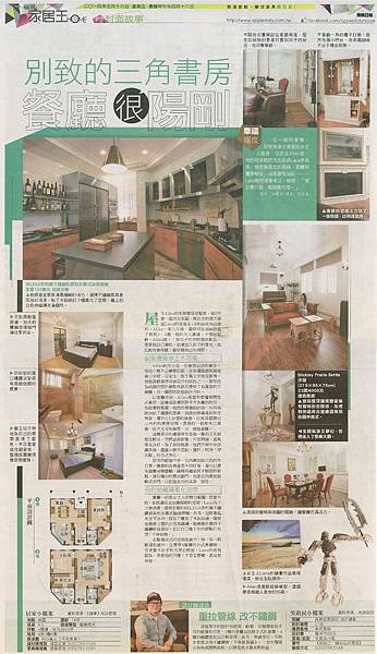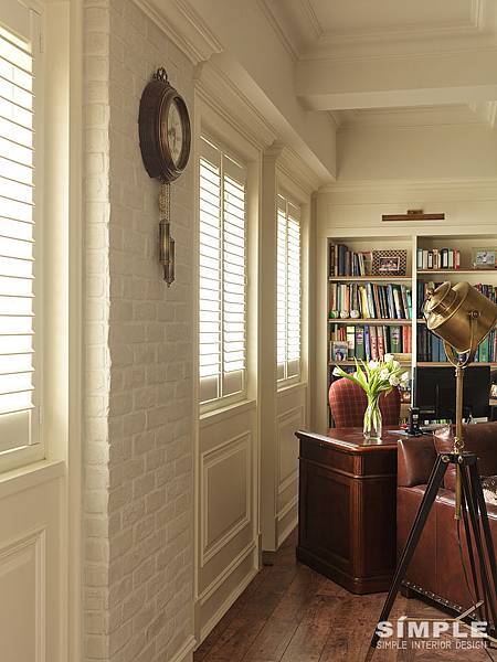 以客廳來說,Allen希望有壁爐和開放式書房,從書桌能看到孩子在客廳的狀況,也能看到電視。她找的幾個設計師,只有吳啟民給了滿意的答案。吳啟民將書桌斜放在角落,置於3人沙發的後面,以家具區隔出三角形的書房空間。書房的一側是木百葉窗,從天光可知晨昏,另一側是書櫃。