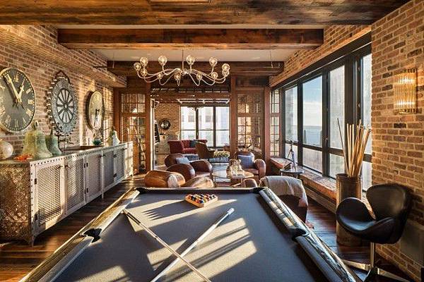 這間被暱稱為“黃金單身漢公寓”空間裡有種豪氣粗曠感,包覆著古典樣式和現代材質的融合,借由經典元素重塑新樣貌,公寓內的撞球區,似乎是回到美國80年代小酒館那種樂鬧場景,直爽率性的風格特色也表現在其他的家飾擺設上,看看牆上的時區時鐘就不是相同款式的了,對吧?!