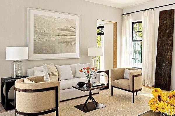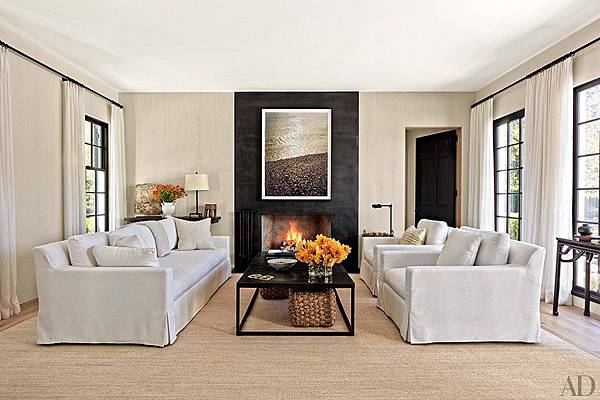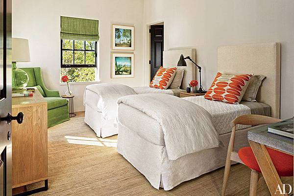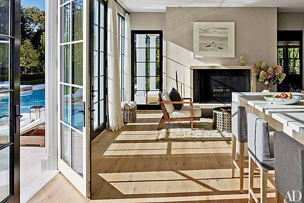 殖民時期建築的外觀搭載現代化的內部設計,大量自然色澤的運用,像是截然舒適的麻布沙發椅、棉質抱枕和透光紗窗簾,一物一色漸層的色澤完美比例,呼應著俐落線條的深色壁爐和Restoration Hardware桌几,客廳另外一頭的小型休憩區,古典圓背單人椅點綴出優雅的氣息,牆上掛上藝術家Chip Hooper的作品和壁爐形成空間對稱,自然採光的客廳裡,推開格子門走出室外,令人目酣神醉的清新園景,是理想中的退休風景。
