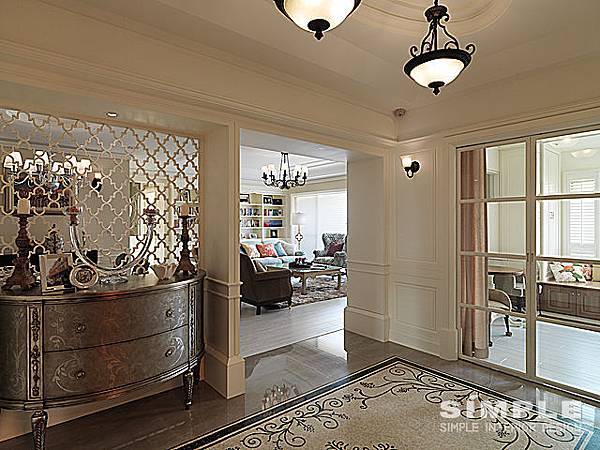 陳公館的設計完全以女主人與兩位女兒的喜好為依歸,處處洋溢著女性優雅的氛圍。一走進陳家住宅玄關,就可見到Lillian August的邊櫃,玄關的拼花磁磚、牆壁的花飾壁紙,與Lillian August玫瑰花飾和諧的連成一氣。