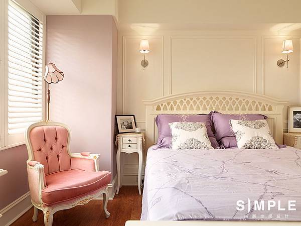 而在主臥,還是以白色為主調,但刻意的加入神祕浪漫的紫色枕頭,明亮熱情的桃紅色單椅,把主臥女性婉約纖柔的氣氛顯現的溢於言表。