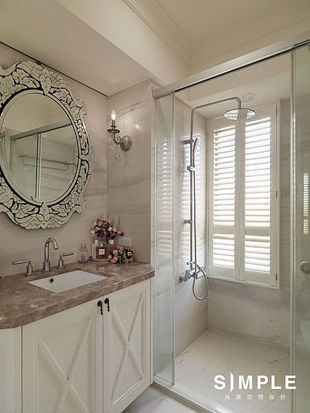 浴室也避開一般常用的明鏡,改用華麗眩目的威尼斯鏡,這也是發揮浪漫美式鄉村風格的延續,不是強調繁複的華麗,倒是有鄉村的俏麗。
