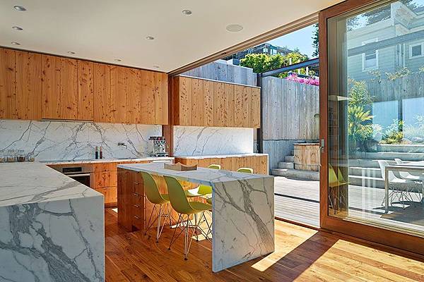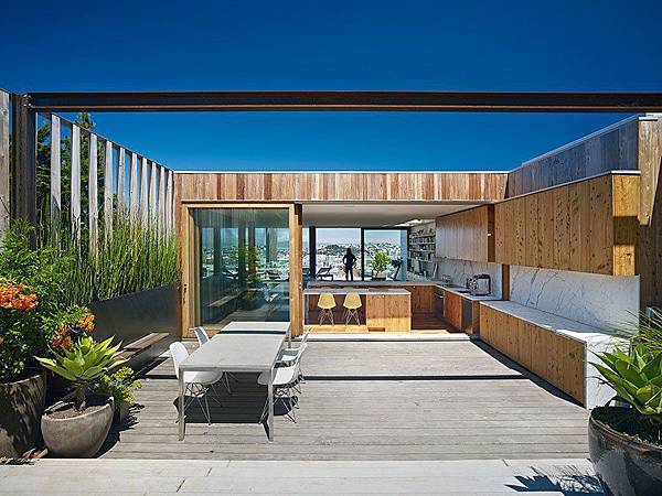 這個開放式的廚房,應該算是開放式廚房的極致了,廚房的一半沒有天花板,夫妻倆在好天氣時,可以享受無止盡的陽光,要是下雨,只要把遮罩拉下就可,這個設計,在天天陽光普照的加州,是行的通的。
