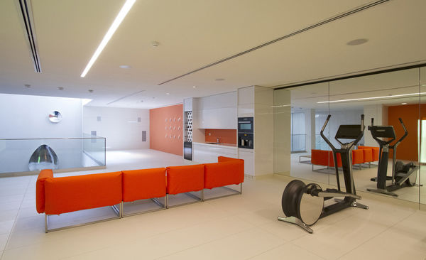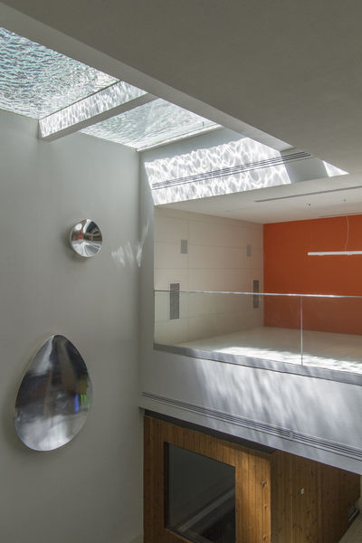 引進光線,是現代住宅設計共通的要點,這棟住宅共有七層樓,除了三個箱型空間,可以充分引進陽光,連位於地下室的泳池及健身房,也透過入口玻璃水池的設計,引進陽光,並且貫穿二樓至五樓的挑空中庭。