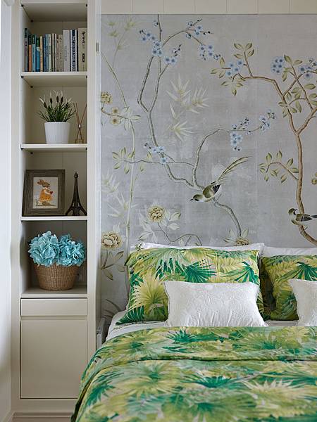 即使是客房也佈置的典雅特別,這客房的床組平常可以收納到牆上,當有客人來時,再把床放下來,讓空間做最有效的運用,但許太太太喜歡牆上的花鳥壁紙,捨不得把床收起來。