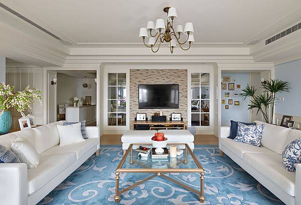 然後天空藍的地毯輝映了牆上的藍調,又特地選了白色的沙發,就像天空中的白雲,讓人看了舒坦無比。