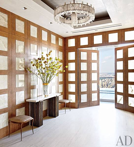 這是位於紐約的一所公寓入口門廳,由橡木木製品插圖與白色瑪瑙板搭配而成的入口大廳,金屬的質地,青銅的几座鑲上大理石的矮几,一派低調的極度優雅。