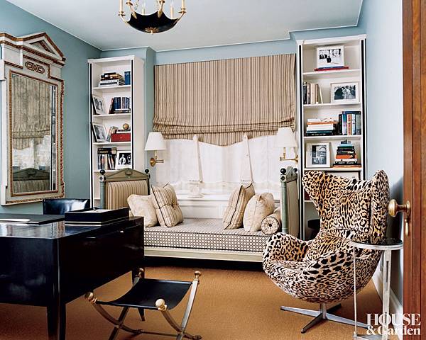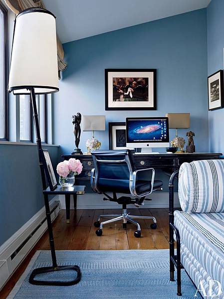 這是個風格多元的混搭佈置,有著不同時代的代表元素,這是位在曼哈頓的家庭辦公室,有著喬治二世風格的鏡子、具現代感的金屬皮椅、帝國時期的吊燈、經典造型的蛋椅。