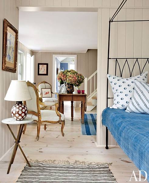 這是紐約東漢普頓,在主人套房休息區的沙發床,有著濃烈的漢普敦海洋休閒風的氣氛。