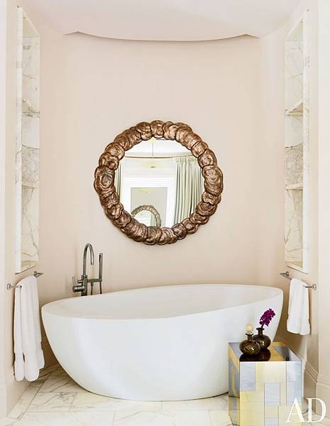 在浴缸上擺上金黃粗框的鏡面,則在浴室的佈置上,形成了視覺的焦點。