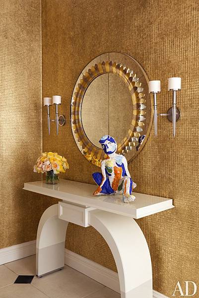 在浴室裡設計一面金光閃閃的牆面,確實是好主意。尤其是有大片的落地窗,可以讓陽光毫無顧忌的灑進來,照射到金黃的壁面,這世界如此耀眼輝煌,人不開朗也不行。