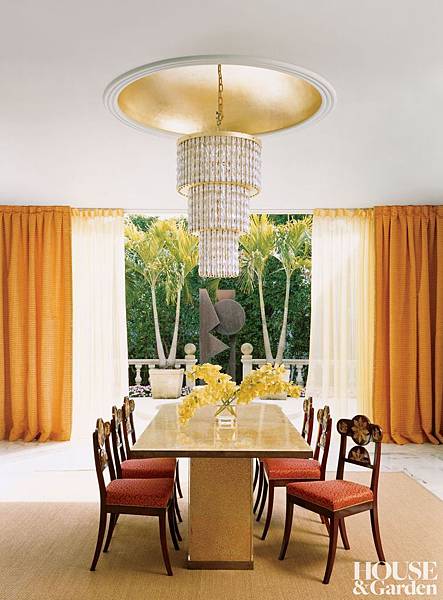 餐廳當然也是,在拱型的天花板,埋藏金黃的顏采,再搭配金黃的窗簾,就是一個閃耀的用餐的環境了。如果要再古典些,設置幾把金黃圖案雕飾的餐椅,就更加分了。