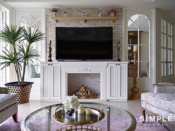 汪公館的設計底色以白色為基底,搭配女主人喜愛的梅子色,俐落大方。在客廳的設計搭配上,以文化石牆與潔白的壁爐形成主體,壁爐的造型跳脫傳統,沒有傳統壁爐的厚重,多了都會風格的簡潔俐落。