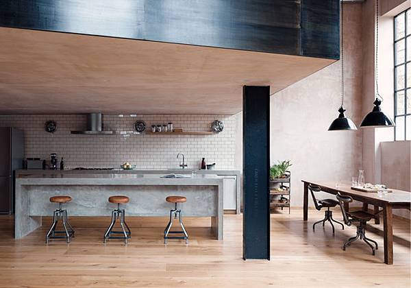 而Clapton Warehouse在廚房中島、衛浴牆面,就選用混凝土及石灰泥等材質,來搭配鐵灰色的樑柱,來凸顯LOFT工業風的設計風格。