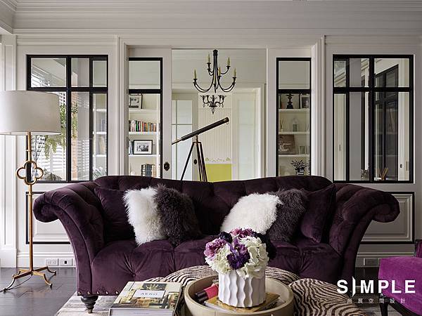 整個屋子的色調,由黑白灰為基底,灰、白牆搭配黑邊白框的窗戶,營造出香奈兒式的復古懷舊氛圍;再由黑白灰的立體色調,來凸顯襯托沙發座椅等家具紫、紅的暖色調,形成既古典又現代的時尚優雅氛圍。