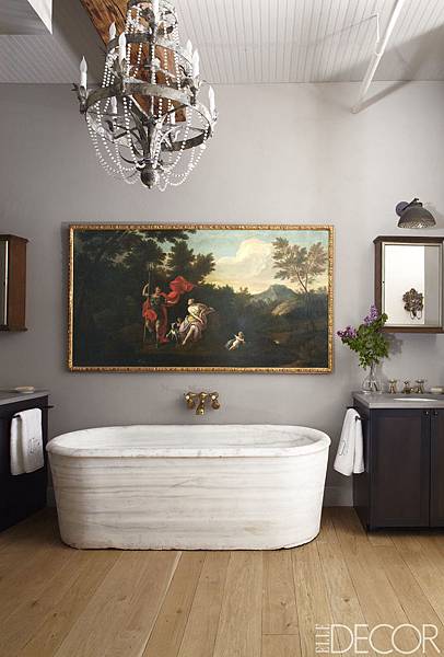 歐美人士確實是很注重藝術涵養,在居家佈置裡繪畫攝影作品是不可少的,並且在不同空間不同的色調,選用最適合搭配的作品,像是這間衛浴空間這三幅