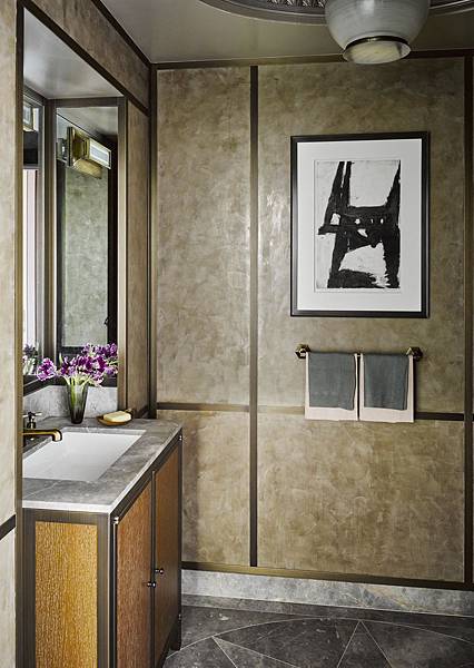這畫作居於這衛浴空間的中心,仔細觀察,這又是深思熟慮的設計。吊架上的雙層毛巾,與洗手台的用色,再把目光擴大到大片牆面的色調,不難體會設計師的巧妙用心。