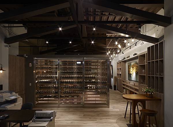 這酒窖的天花板是個亮點,我們採用巨型木條,編列成歐式建築的型態,木質的斜式天花板,在現代的空間裡有仿古的氣氛,特別讓人感到溫暖。