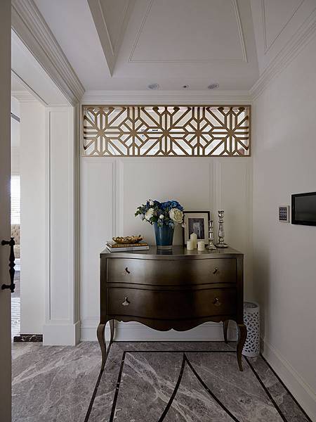 不論是採用怎樣的美式風格設計,充足的採光與空間的通透感,一向是尚展設計的基本理念。一進門的玄關,我們即在玄關桌的上方,設計了簍空的立體雕飾天窗,這個設計已經彰顯了整體的設計風格,有簡潔的古典線條,簍空的天窗可以引進更多的光線,讓空間顯得明亮通透。