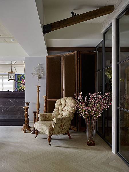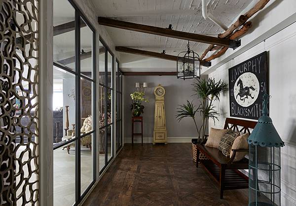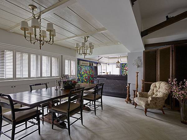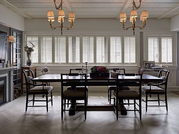 在尚展設計的大廳,安皇后時期的原木長桌,一長排的可開啟折疊的百葉窗,電子暖爐與經典壁爐,燈具與擺飾種種配飾,讓人一走進尚展設計辦公室,除了古典的時尚感外,可以立刻感受到美式設計風格的舒適、大器、溫暖、療癒的氛圍。