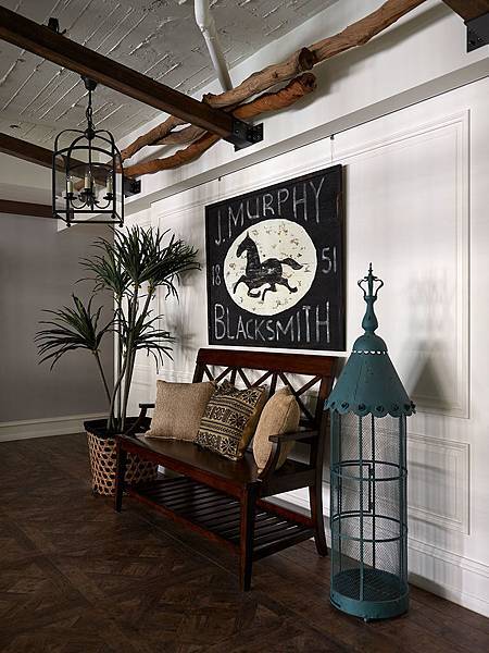 入口玄關懸掛一匹黑馬,寫著「Black Smith」的版畫,則又增加了古樸的異國風情「Black Smith」指的是十七世紀歐洲的鐵匠,隱隱鋪陳了美式風格設計的歷史源頭,給美式設計風格的傳承給了個線索。