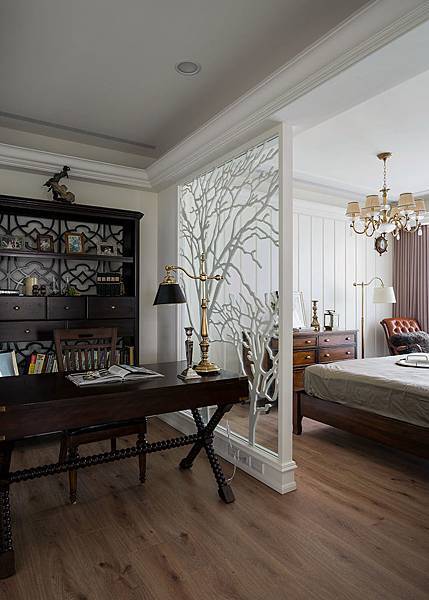 臥室的白色樹木造型屏風,是張先生喜愛的設計。白色屏風放置在臥房與閱讀區書桌之間,除發揮空間區隔功能,也當成一個視覺凝聚的焦點,豐富了人文的藝術性。