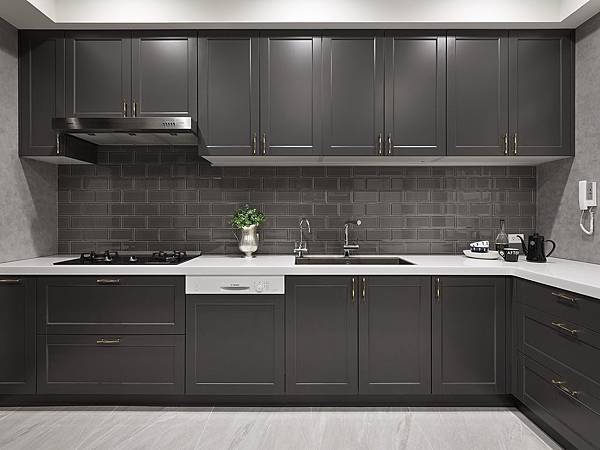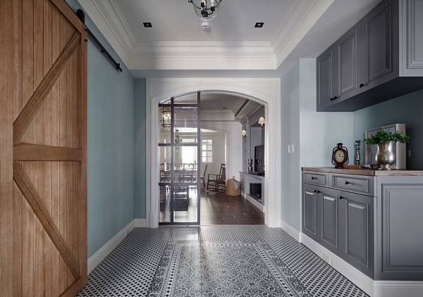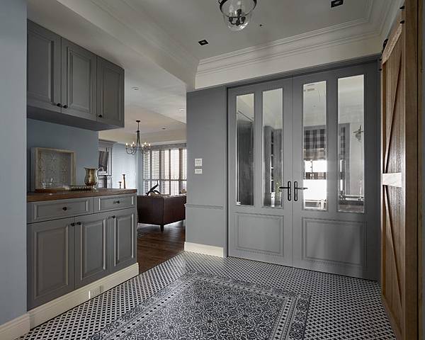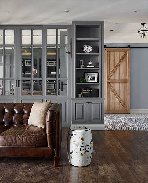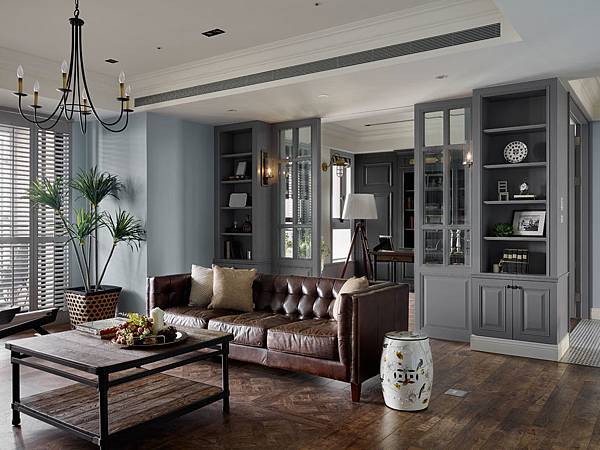 我們採用灰藍與咖啡色作為室內主要的色調,以灰藍為主的牆面與櫥櫃是視覺的焦點。搭配皮質沙發,深色的地板,營造的是冷靜沈穩的英倫風情,有一點點歷史的重量,時間的刻痕感。