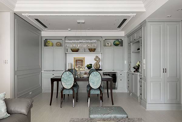 從玄關進來到客廳,有個長廊的牆面,這兒主要可以陳列畫作、唐卡等。在廚房餐廳的空間,我們建構了收藏展示的櫥櫃系統。