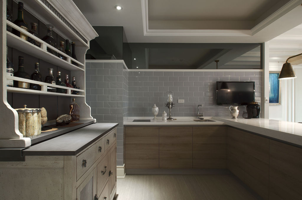 廚房烹飪區回歸寧靜簡單,靜下心享受烹飪的樂趣,在烹飪區與長型餐桌之間,架構休憩的L型中島吧檯