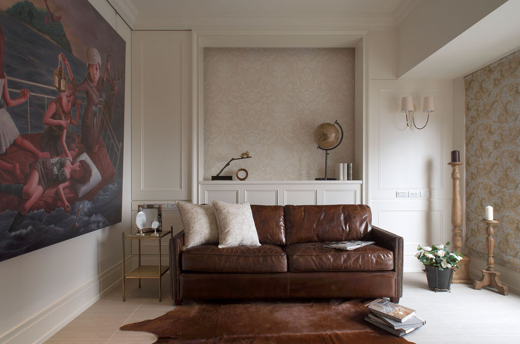 白底線板牆面襯托出深咖啡沙發與地毯的質感,微量金元素在古典壁燈與佈置品上,點亮空間,低調的古典空間,留給珍藏畫作展示。